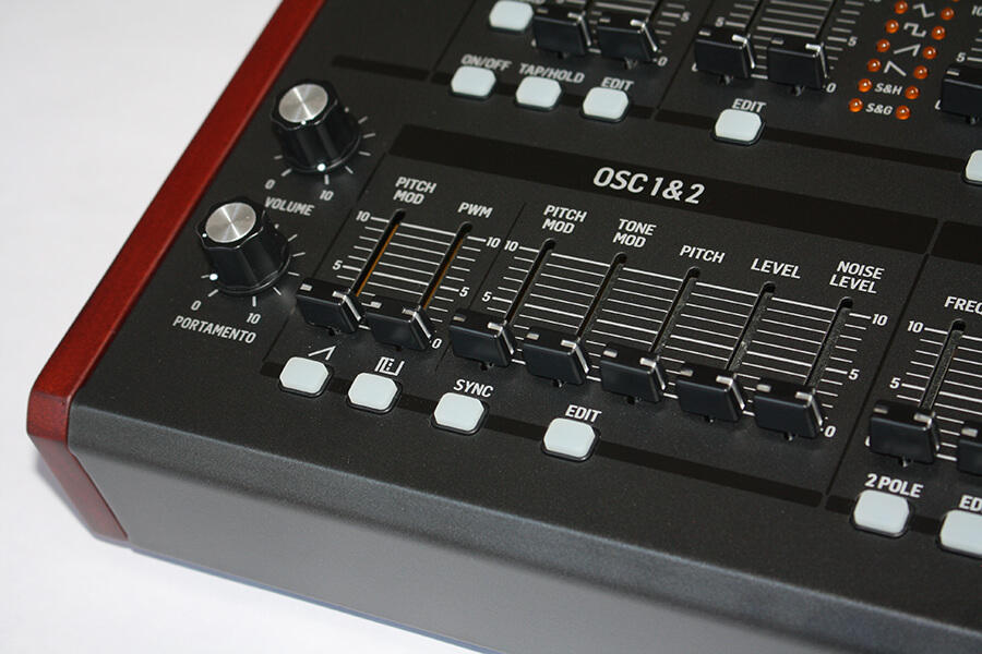 - 12 voices with 2 analog OSCs per voice with oscillator sync mode