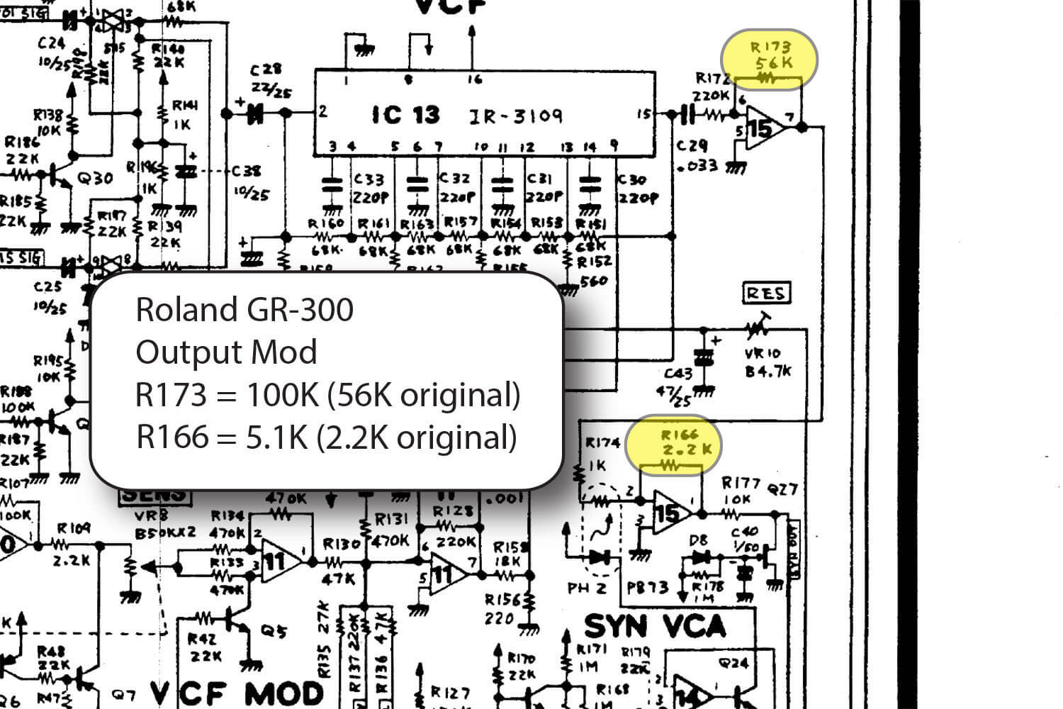 Here is a simple modification to increase the output of the GR-300. This is a simplified version of the ALG output upgrade. Just replace two resistors, found in the negative feedback loops of the final output stages of the GR-300. Changing R173 from 56K to 100K provides a stronger signal to the VCA, and changing R166 from 2.2K to 5.1K adds more level to the final output stage.