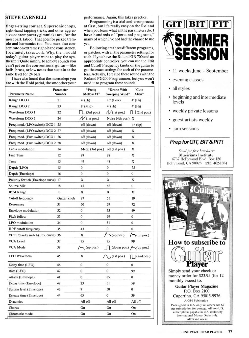 Following are three different programs, or patches, with all the parameter settings for each. If you have the Roland GR-700 and an appropriate controller, you can use the Edit and Cutoff Frequency knobs on the guitar to get the exact settings for each of the parameters. Actually, I created these sounds with the Roland PG-200 Programmer, but you won’t need it to program these sounds.