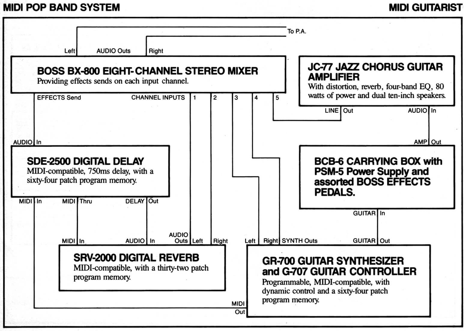 And don't forget about Roland's complete line of quality sound reinforcement and signal processing gear. (If you don't amplify the band's sound properly, all the magic you create with MIDI will fall on deaf ears.) Check out the BOSS BX-8000 Stereo Mixer, the JC-77Jazz Chorus Amp, the BN-100 Bass Amp, the Cube line of keyboar amps, and the exciting SDE-2000 Digital Reverb, both with MIDI, integrated in the diagrams shown.